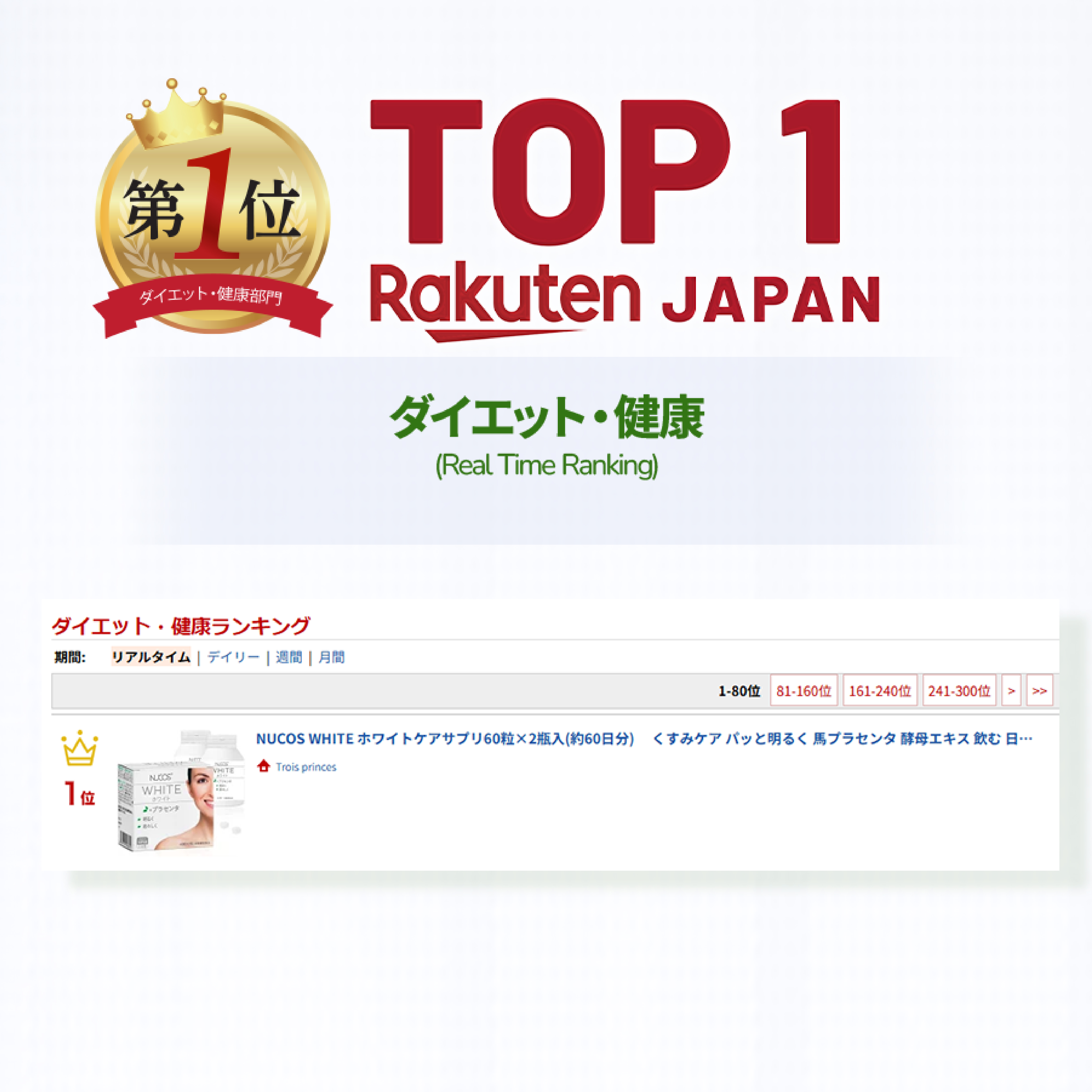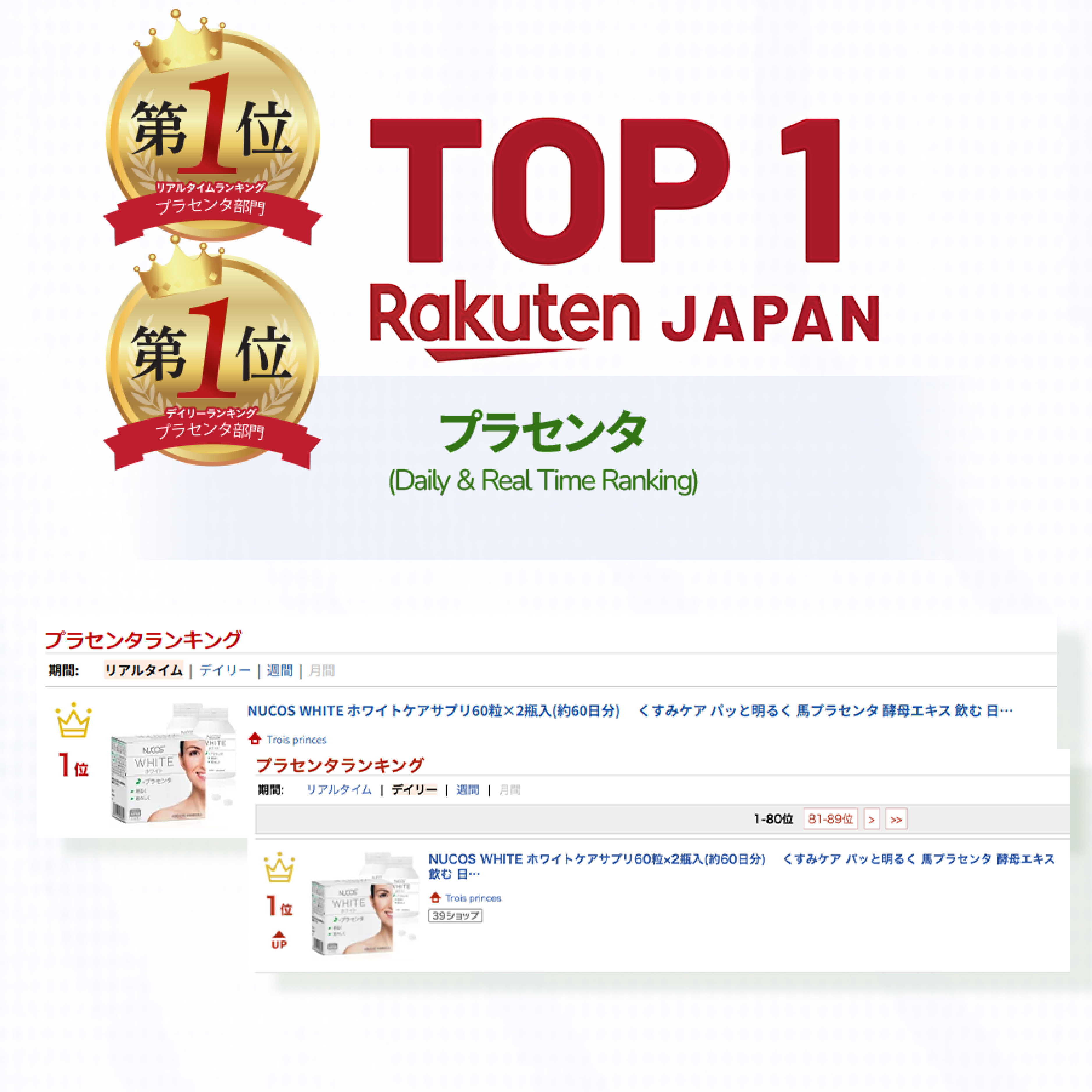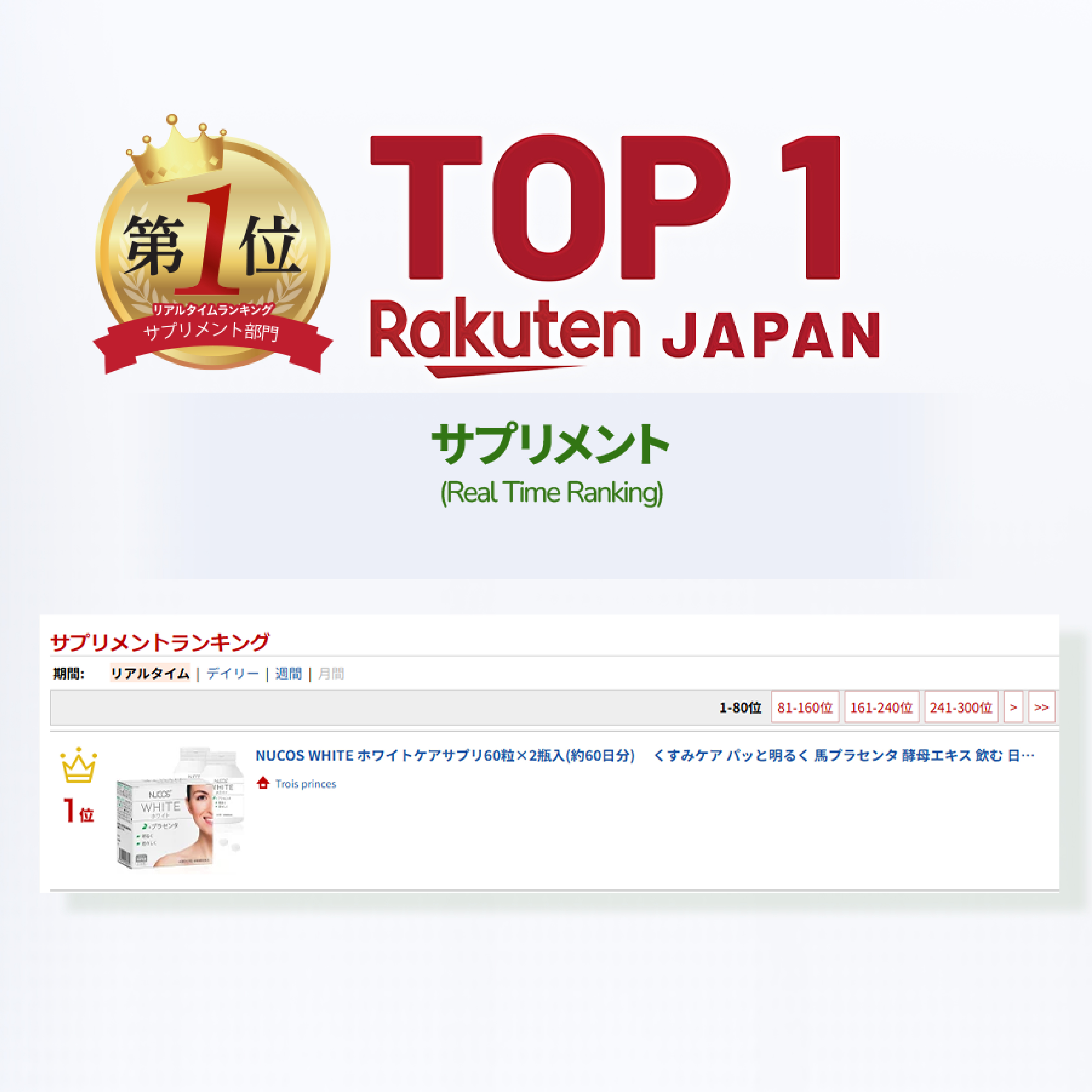2025年4月21日、NUCOS WHITE は日本の電子商取引プラットフォーム Rakuten において、以下の4部門で見事に 第1位 を獲得しました。これは、消費者からの信頼を表す指標とも言われています: